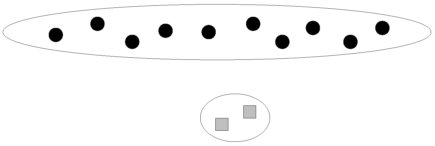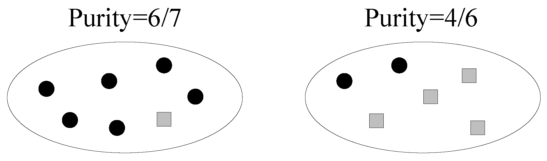 An example of the purity calculation. Small circles and squares are data points of different types. Data points of the same type should be clustered.