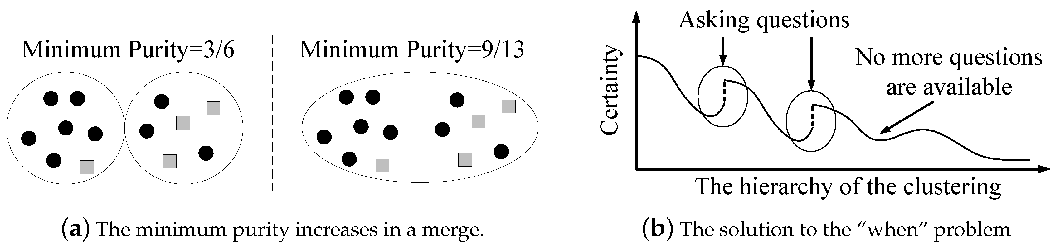 We want to maximize the minimum purity during the cluster-building process. The total number of questions (denoted by Q) is limited, since human computations are relatively costly. One may think that the minimum purity monotonously decreases when the hierarchy of the clustering moves up, and thus the machine should ask questions when it encounters a significant certainty reduction. However, the machine is likely to encounter numerous certainty reductions during the cluster-building process, while the available question operations may not be enough. Moreover, how could the machine determine whether a certainty reduction is significant or not? This is very challenging, and can be data-sensitive. The key observation is that the minimum purity may increase, as shown in Figure 5a. In the left part of Figure 5a, the purity of these two clusters are (black circle dominates) and (a tie), respectively. Hence, the minimum purity is . In the right part of Figure 5a, the purity (and the minimum purity) is (black circle dominates). When the machine merges a cluster with a high purity and a cluster with the lowest purity, the minimum purity may increase. Therefore, during the cluster-building process, the minimum purity may decrease with some oscillations, i.e., local minimums exist. These local minimums indicate the time for the machine to ask questions. This is because increased minimum purity means error propagation, where a cluster with a high purity is contaminated by a dirty one. Error propagations should be controlled.
