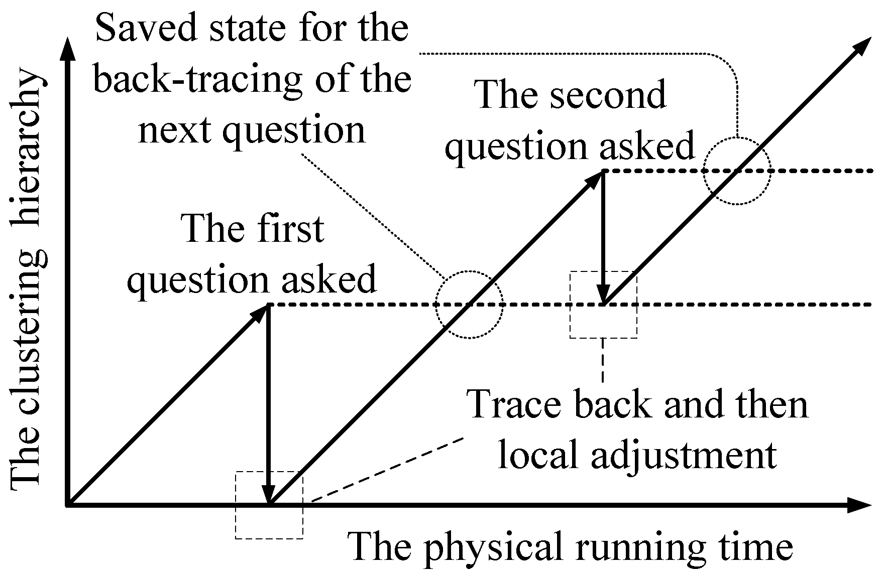 Our solution to the “how” problem is (1) first tracing back to a previous clustering state; (2) then doing local adjustment; and (3) finally resuming the building of the clustering hierarchy. It is shown in Figure 6 (assume that the human’s answer disagrees with the machine’s clustering results for the two questions). The depth of the back-tracing represents the trade-off between the time complexity and the accuracy. To limit the depth of the back-tracing, the machine only traces back to the hierarchy of the latest adjustment, as shown in Figure 6 (for the first question, the machine traces back to the initial state). After doing local adjustment, the machine resumes building the clustering hierarchy without question operations. The question operations are disabled until the machine goes back up the hierarchy that was present when it asked the question. Once the adjustment of the current question is finished, the state of the clustering is saved as the point to trace back to for the next question. Since each hierarchical state is calculated at most twice, this scheme at most doubles the time complexity.