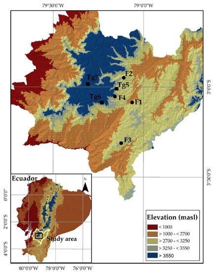 Seven study sites (Figure 1) expanding between 2705 and 3766 m a.s.l. were selected at three elevation zones: (1) F1 and F2, located below 3250 m a.s.l. corresponding to the high montane forest ecosystem; (2) F3, F4, and Tg5, located between 3250 and 3550 m a.s.l. representing the transition zone between high montane forest and páramo; and (3) Tg6 and Tg7 located above 3550 m a.s.l. being occupied by páramo.