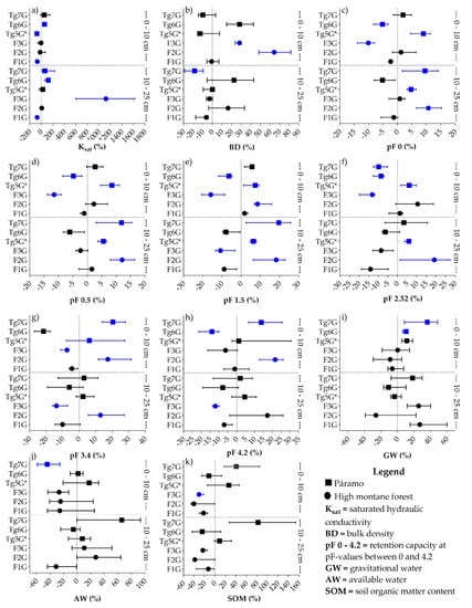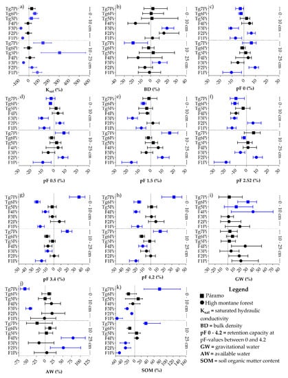 Pine afforestation produced significant changes in the hydro-physical properties and SOM content in both layers as depicted in the forest plots of Figure 2 and Appendix Table A2. Ksat of the upper layer decreased significantly in the F1Pi and F3Pi plantations (61.72% and 79.06%, respectively), which are located in the high montane forest area. In the páramo plantations, the Ksat value increased significantly in two of the three plantations (Tg5Pi and Tg6Pi) by 25.23 and 59.22%, respectively (see Figure 2a). The BD value did not show significant changes in most of the sites except for F3Pi which increased significantly by 18.42% (Figure 2b). As further depicted in Figure 2c, the water retention capacity at saturation (pF 0) in the upper layer decreased significantly in the F1Pi, F3Pi, Tg6Pi and Tg7Pi sites, with a reduction between 2.53% and 11.10%, while in F2Pi the water content at saturation increased significantly by 6.30% (Figure 2c). The changing tendency in water retention capacity in the pF range from 0.5 to 2.52 (see Figure 2d–f) was similar to the change in the water retention capacity at pF 0 in most of the plantations, supporting the conclusion that pine afforestation led to significant changes in the soil’s hydro-physical properties. The water retention capacity at pF 3.4 and pF 4.2 (Figure 2g,h) decreased meaningfully between 12.21% and 27.52% in the F1Pi, F4Pi, and Tg6Pi sites, but differently in the Tg7Pi site where the increase was significant, varying between 15.54% and 44.31%. The GW in F4Pi, Tg5Pi and Tg6Pi increased significantly (13.15%–39.37%) (Figure 2i), while AW decreased considerably in F3Pi and Tg7Pi, with a reduction varying between 42.50% and 57.64%, (Figure 2j). The SOM content in F1Pi, F2Pi and F3Pi decreased considerably, by 28.97%, 29.00% and 47.90% (Figure 2k); while in Tg7Pi the SOM content was significantly reduced by 77.62%.