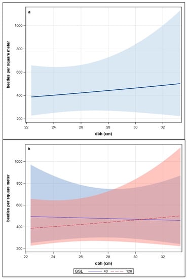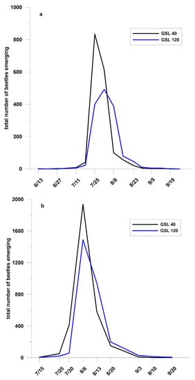 There was no relationship between the number of emerging beetles and tree dbh (F = 0.07, p > 0.79), nor GSL (F = 0.3, p > 0.59) nor their interaction (F = 0.24, p > 0.63) (Figure 1a). The plots describing the relationship for each GSL had complete overlap of the 95% confidence intervals (Figure 1b) (Table A3). Temporal emergence pattern of beetles across the season was the same from trees in the GSL 40 and 120 except that in 2007, emergence in GSL 120 peaked a week later than in GSL 40 (Figure 2a,b). In 2007, peak emergence occurred in late-July to early August and beetles were caught from 13 June, the first date traps were checked, through 19 September. In 2008, peak emergence occurred in late-July to mid-August and beetles were caught from 15 July, the first date traps were checked, through 20 September.