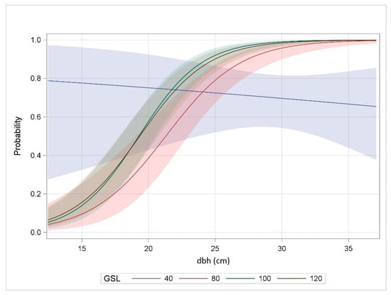 The probability of tree attack was significantly influenced by GSL (F = 8.2, p < 0.0001) and tree dbh (F = 105.4, p < 0.0001) and the interaction was also significant (F = 13.1, p < 0.0001) (Table A4). For GSL 80, 100, and 120, the probability of tree attack increased with tree diameter but remained constant for GSL 40 across the range of dbh examined (Figure 3). The probability of attack approached 1 for GSLs 100 and 120 with a dbh of 30 cm and for GSL 80 with a dbh of 35 cm. As a result of the significant interaction, pairwise differences in the probability of tree attack between GSLs varied across dbh (Table 3).