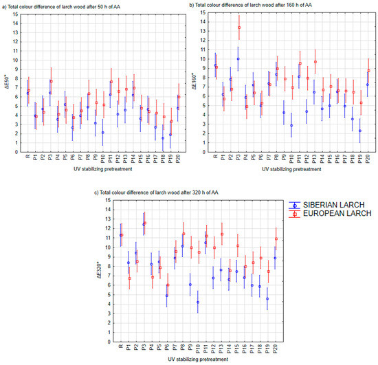 - ∆E160*—total color difference between the initial color of wood and color after 160 h of AA;