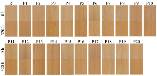 - ∆E320*—total color difference between the initial color of wood and color after 320 h of AA.