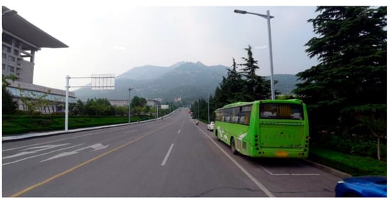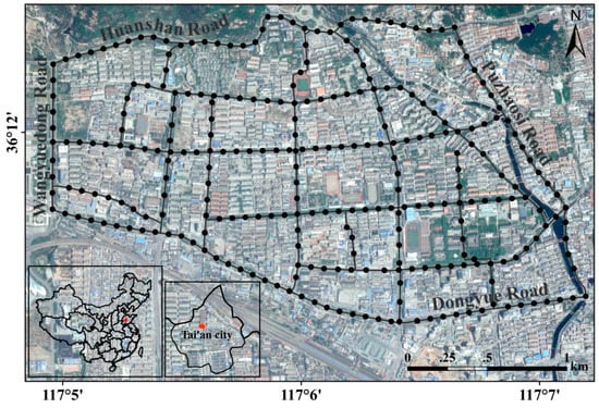 The study was conducted in the downtown of Tai’an city, China (Figure 2), which was covered with BSV images captured in summer period of 2016. The study area is enclosed by the Huanshan Road (2.73 km in length), Puzhaosi Road (1.97 km), Dongyue Road (3.50 km), and Wangyuedong Road (0.92 km). The main street system in the study area was generated referring to the Open Street Map (openstreetmap.org) and were overlaid on a 0.5 m spatial resolution RS image acquired in May, 2016. According to previous studies, Tai’an city is a representative area in urban greenery study for its high green vegetation coverage rates through north China (e.g., [,,]), a more rational estimation of profile greenery is indispensable for local urban landscape planning and management.