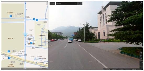 Where “width” and “height” specified the output size of the requested image, and “location” provided the geography location of BSV image. The letter “h” in the URL meant the compass heading of the camera (ranging from 0 to 360), and “p” was the vertical angle of the camera relative to the street view vehicle. Here, the “h” and “p” were both “0”, which meant the image was acquired when the BSV vehicle was heading north with a horizontal view angle. Figure 4 is the BSV static image using the access above.