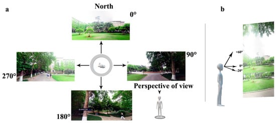 To distinguish the green areas that pedestrian can see, BSV images in four directions and three different vertical view angles in each direction were acquired for every street sample site. Considering the horizontal covering ranges of BSV images, four images were adequate to cover the 360° horizontal surroundings; therefore, the “h” in the URL was set to 0, 90, 180, and 270, respectively (Figure 5a). Due to the limitation of BSV vehicle camera’s base part, the vertical angle range of BSV images was from +90° to −20°, therefore the parameter “p” was set to three angles, i.e., +60 and 0 to avoid repeat part, and −20, which was the maximum down-looking angle (Figure 5b). However, as showed in Figure 5b, images of vertical angle 0°and −20° had distinct duplicative green vegetation parts, which may lead to overestimation of green vegetation results. Therefore, the repeated part of the two angles were split and discarded from that of vertical angle −20°. Finally, 3336 images were downloaded and stored for green vegetation classification and BGVI calculation.