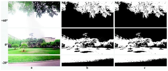 The green vegetation results of all the 3336 BSV images were extracted using the SVM method, and three vertical BSV images in a representative street sample site are shown in Figure 6. Figure 6a were the original BSV images, Figure 6b showed the examples of vegetation classification results based on SVM, and Figure 6c were the refinement results.