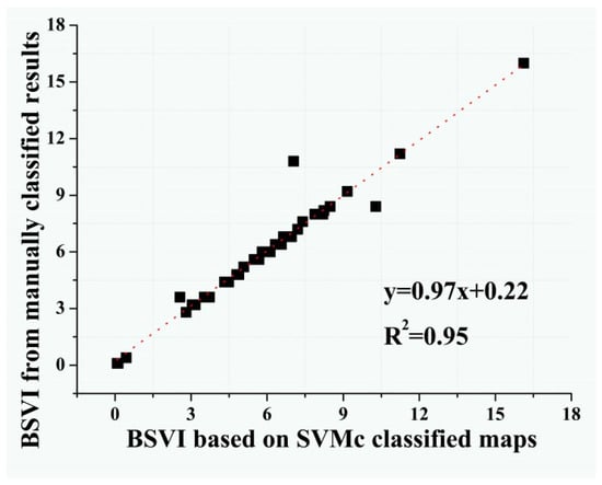 Accuracy estimation of the classification results was conducted using 50 of the 278 street sample sites. A scatter plot (see Figure 7) showed the relationship between the values of the BGVI calculated using classified maps from SVM classification method and the corresponding values calculated based on the manually classified data. It can be found that BGVI values were mainly distributed near the 1:1 line with the regression coefficient up to 0.95, which meant that BGVI values calculated using the two methods were quite similar. Additionally, the root mean square error value was 0.26, which indicated that the BGVI calculated using SVM method was of high quality.