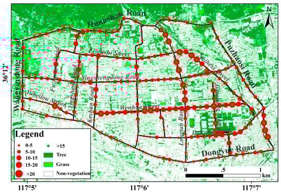 Statistical results found that there were 108 street sample sites with BGVI < 5, and the lowest BGVI value was 0.10. These sites were mainly located in the E-W direction of the Dongyue Road (30 sites) and Huanshan Road (11 sites), and in a N-S direction for the Aolaifeng Road (15 sites), which may not seem so green in the pedestrians’ views. Moreover, there were 112 sites with BGVI values ranging in [5,10), which were mainly distributed in the E-W Huanshan, Leigushi, and Yingshengdong Road and the N-S Puzhaosi Road. Among the 58 street sample sites with BGVI values higher than or equal to 10, 37 sites’ values ranged between 10 and 15, E-W Wenhua Road contained 13 of the 37 sites, which was the most in this interval (Figure 8), and there were 21 sites with BGVI values ≥15. An analysis found that these high BGVI street sample sites were mainly located in the N-S road sector of the east portion of the study area, which meant this region may look “greener” than the other places in the pedestrians’ views, based on the randomly selected street sample sites. Among these 21 sites, three sites were located on the N-S Puzhaosi Road in the east border, three on the N-S Jiaochang Street, and three on the N-S Naihexi Road. Moreover, the N-S Longtan Road contained seven sites with BGVI value higher than 15, which was the most throughout the road system. In the E-W sector, Wenhua Street in the middle portion of the study area consisted of four sites ≥15 with two dispersedly located in the ends of the street; only one site with the BGVI value ≥15 was located in the southwest east-west Yubeilou Street (Figure 8).