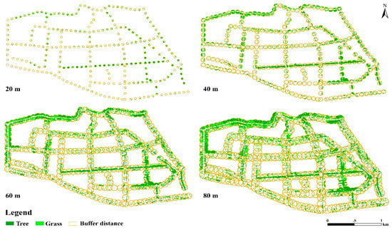 Table 2 provided the Pearson’s correlation coefficients between BGVI values and green vegetation coverage area interpreted from RS images at 20, 40, 60, and 80 m buffer distances around the street sample sites, considering the maximum street width in the study area. The results of canopy and grass coverage area were displayed in dark and light green colors in the different buffer circles, respectively (Figure 9).