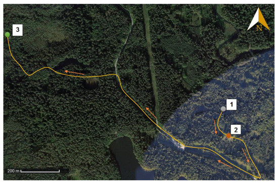 The forest areas used in this study, numbered from 1 to 3 (Figure 1), were parts of the nature reserve Redykajny. The whole area of the reserve is covered mainly by 85- to 130-year-old Picea abies (L.) H. Karst. and 80- to 180-year-old Pinus sylvestris. L. Area 1 is covered by 105-year-old P. abies (40%), 180-year-old P. sylvestris (40%), 85-year-old P. abies (20%), and a mixture of additional species (Quercus robur L., Fagus sylvatica L.: 20%). Species composition in Area 2 is the same, but a less-dense part of the stand was selected—an area previously prepared by foresters for regeneration, leaving 200 residual trees/ha. Area 3 is covered by 60-year-old, 90-year-old, and 120-year-old P. abies (10%, 50%, and 20%, respectively), along with Alnus glutinosa (L.) Gaertn., Betula pendula Roth and 80-year-old P. abies (10% each). The ground in the part of the reserve intended for the forest recreation program is covered with moss and herbaceous vegetation. All views in this selected place were of the forest alone, undisturbed by buildings or other objects.