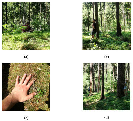 Activities undertaken during a forest recreation intervention: (a) Listening to the sounds of the forest; (b) viewing the forest; (c) touching forest items; (d) cuddling up to a tree. All photos provided by F. Ordon.