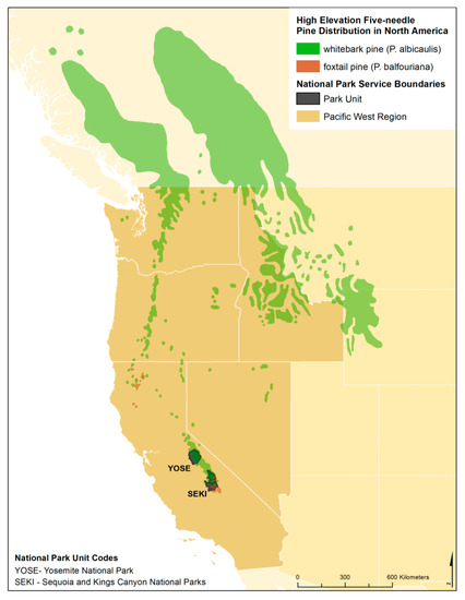 Five-needle white pines (Family Pinaceae, Genus Pinus, Subgenus Strobus), and in particular whitebark pine (Pinus albicaulis Engelm.) and foxtail pine (P. balfouriana ssp. austrina R.J. Mastrog & J.D. Mastrog) are foundational species [10] in upper subalpine and treeline forests of several National Park Service (NPS) Pacific West Region (PWR) parks, including Sequoia and Kings Canyon National Parks (SEKI) and Yosemite National Park (YOSE) (Figure 1). Declines in foundation tree species are a particularly pernicious threat to regional and global biodiversity because trees provide fundamental structure to ecosystems that is not replicated by other organisms [11]. If a foundation tree species is lost from these systems, it can precipitate cascading shifts in biological diversity, ecosystem function and services, and community stability [12].