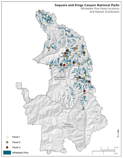 The following are available online at http://www.mdpi.com/1999-4907/10/1/35/s1, Table S1: Location and site characteristics for the whitebark pine sample frame in Yosemite National Park, CA, USA (n = 35). Table S2: Location and site characteristic for the whitebark pine sample frame in Sequoia and Kings Canyon National Parks, CA, USA (n = 31). Table S3: Location and site characteristics for the foxtail pine sample frame in Sequoia and Kings Canyon National Parks, CA, USA (n = 33).