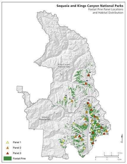 Foxtail pine distribution and plot locations in Sequoia and Kings Canyon National Parks, CA, USA. Plots are assigned to one of three panels (12 plots each) and are sampled using a rotating re-visit design. Thirty-three of the planned 36 plots had been installed at time of publication.