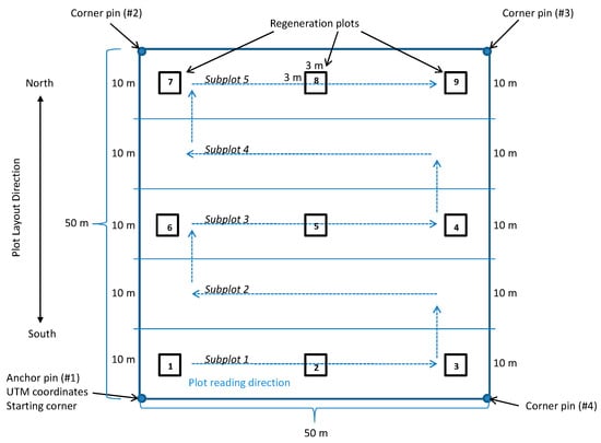 A total of nine square regeneration plots (3 × 3 m) were established within each macroplot to measure seedling regeneration (Figure 7). Regeneration plots are located at each corner, at each midpoint between corners, and in the middle of the macroplot.