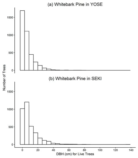 Histogram of all live whitebark pine diameter at 1.37 m (DBH) in Yosemite National Park (YOSE), CA, USA (a) and Sequoia and Kings Canyon National Parks (SEKI), CA, USA (b). DBH ranged from 0.4 to 78.3 cm in YOSE and 0.4 to 136.5 in SEKI.