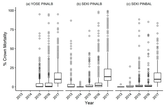 Individual tree percent crown mortality by year in (a) Yosemite National Park whitebark pine sample frame (YOSE PINALB), (b) Sequoia and Kings Canyon National Parks whitebark pine sample frame (SEKI PINALB), and (c) Sequoia and Kings Canyon National Parks foxtail pine sample frame (SEKI PINBAL).
