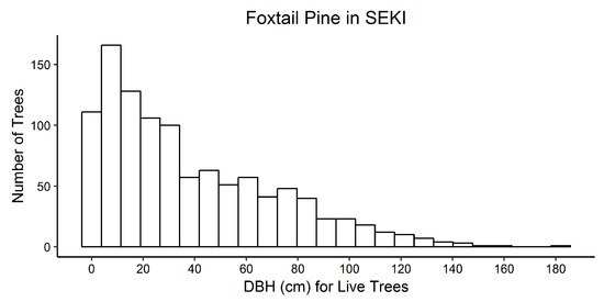 Histogram of all live foxtail pine diameter at 1.37 m (DBH) in Sequoia and Kings Canyon National Parks (SEKI), CA, USA. DBH ranged from 0.4 to 182.3 cm.