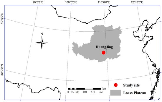 We conducted this study in the Shuanglong forest region (35.6118° N, 109.2048° E, Figure 1), which is located in the central Loess Plateau, Huangling County, Shaanxi Province, China. The region has a temperate and monsoonal climate with a mean annual temperature of 9.4 °C, and the average annual precipitation is 588.1 mm [47]. According to long-term forest management data from the Shuanglong forest farm, the mean annual frost-free period is approximately 195 days, and the mean length of the growing season is approximately 204 days. The soil of the region is classified as calcareous cinnamon soil or forest Haplic Greyzem soil.