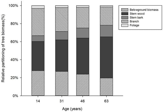 The partitioning of tree component biomass in each of the four stands is shown in Figure 2. The aboveground biomass represented 72.25%, 73.05%, 76.14%, and 80.37% of total tree biomass in the 14-, 31-, 46-, and 63-year-old stands, respectively. Among the different components, stem wood contributed 332.44%, 35.03%, 40.12%, and 45.72%, to total tree biomass in the 14-, 31-, 46-, and 63-year-old stands, respectively. The partitioning of branch biomass was approximately equivalent to that of belowground biomass, which comprised a large proportion that should not be neglected. Biomass allocation demonstrated different changes with stand age. The proportions of stem wood and stem bark increased with stand age while the proportions of branches, foliage, and belowground biomass (including taproot, large roots, coarse roots, small roots, and fine roots) decreased with stand age.
