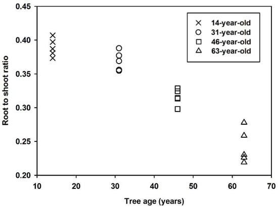 Root-to-shoot biomass ratios of harvested trees in the 14-, 31-, 46-, and 63-year-old Q. acutissima stands.