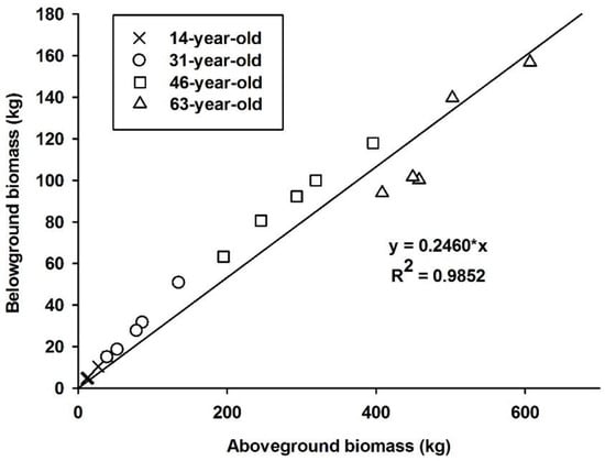 As stand age increased, the root-to-shoot biomass ratio of Q. acutissima decreased gradually (as shown in Figure 3). It decreased from 0.39 in the 14-year-old stand to 0.37, 0.31, and 0.24 in the 31-, 46-, and 63-year-old stands, respectively. Accordingly, there was a decline in relative root biomass with stand age. A rather constant relationship was also revealed by regressing the belowground and aboveground biomass data from 20 harvested trees from all four stands (Figure 4). There was a linear relationship between aboveground and belowground biomass with a slope of 0.25.