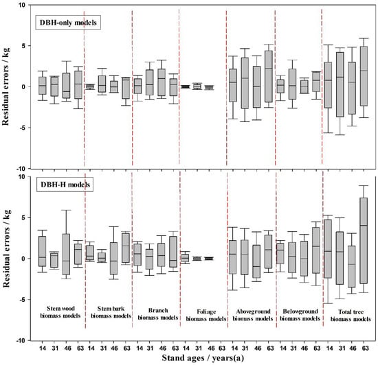 Distribution of residual errors of biomass model in the 14-, 31-, 46-, and 63-year-old Q. acutissima stands. The box plots display the whiskers, percentiles, and mean of the predicted biomass errors for each tree component.