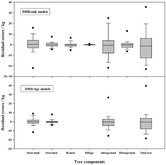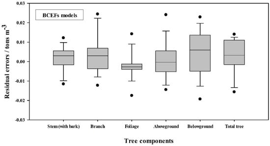 Distribution of residual errors of BCEFs model of Q. acutissima. The box plots display the whiskers, percentiles, and the mean of the predicted BCEFs errors for each tree component as well as outliers.