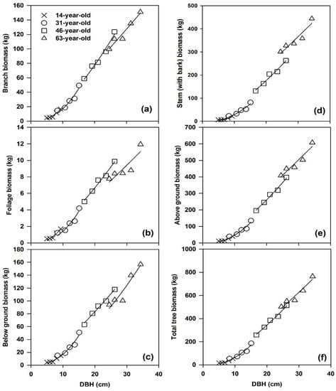 Relationships between DBH and branch (a), foliage (b), belowground (c), stem (with bark), (d), aboveground (e), and total tree (f) biomass in the 14-, 31-, 46-, and 63-year-old Q. acutissima stands.