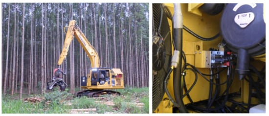 Excavators are often used as a base for building low-cost harvesters and represent a good alternative to purpose-built units []. The versatility of excavator-based harvesters improves overall economics when the harvester function is used for a relatively short proportion of the annual work time, which makes them ideal for part-time users []. Excavator-based machines are especially suited to tree farms and to stationary tasks (e.g., processing), where the special cross-country mobility of purpose-built harvesters is not required. Furthermore, excavators are robust, relatively inexpensive, and can be bought and serviced almost everywhere in the world. Local manufacturing and service do not only offer a fundamental logistical advantage, but they also result in a much cheaper purchase and maintenance cost in many countries where high trade tariffs are applied to imported products []. In fact, this is one of the main reasons for the immense popularity of excavator-based harvesters in much of Asia and South America.