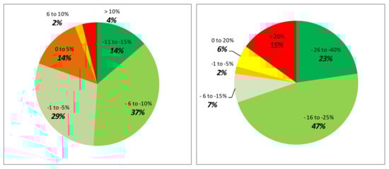 Distribution of the number of units according to the percent variation in fuel use after installing the adaptation kit. The variation calculated in l hour−1 (left) and in l m−3 (right).