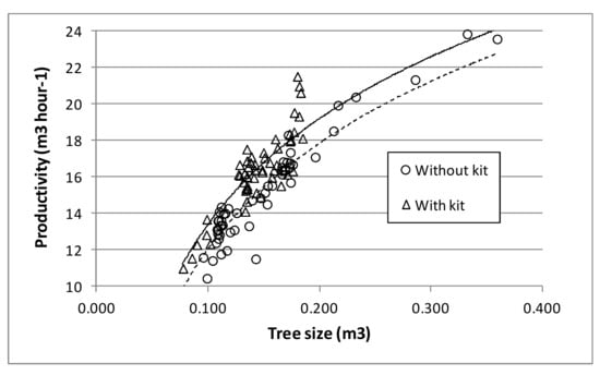 Moreover, the equation indicated that installing the adaptation kit had small, but positive, effect on productivity. Therefore, fuel savings were not gained at the cost of lower productivity. Fuel consumption was reduced not by crudely restricting fuel flow, but also by optimizing the excavator-head interface. The equation had a typical logarithm shape that described the law of diminishing returns, whereby the productivity increases associated with increasing stem size became progressively smaller as stem size kept increasing (Figure 3).