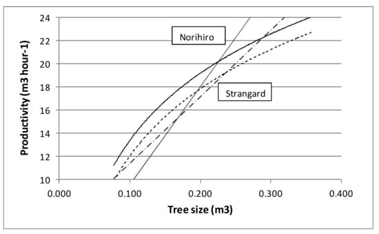 This same character applies to the results of the productivity study, as well. In that case, the prediction may also be rather accurate, because the productivity model obtained from the regression analysis is able to explain most of the variability in the dataset. So, the model is both robust and accurate. This statement is corroborated by the comparison with other similar studies, and in particular, by the good match with the productivity models recently published by Strandgard et al. [] and by Norihiro et al. [] for plantation eucalypt, respectively in Australia (E. globulus) and South Africa (E. grandis × camaldulensis, E. grandis × urophylla, E. smitthii, and E. dunnii) (Figure 4). Although these models represent different curve shapes—linear instead of logarithmic—the graphs are quite near to each other and represent very similar trends. What is more, the estimates obtained from this study are also in agreement with the figures reported in many other studies concerned with the productivity of CTL harvesters in eucalypt plantations, which span a period of 20 years [,,,,,,,,]. Of course, agreement is not universal, and four short-term time studies conducted in Brazil report productivity figures that are approximately 50% higher than those indicated here [,,,]. However, an overwhelming majority within the relevant literature supports the model estimated in this study, offering a strong independent validation of its general accuracy and reliability.