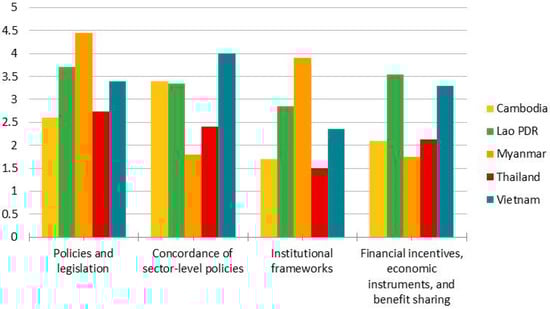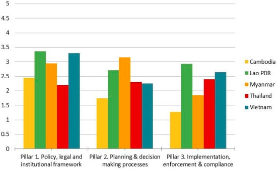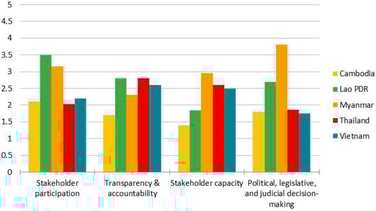 The most critical scores in the pillar, were “Political, legislative and judicial decision making” for Cambodia, Thailand and Vietnam (categorized as “failing”), “Stakeholder capacity” for Cambodia and Lao PDR, and “Transparency and accountability” for Cambodia—for all three cases the scores were lower than two—evaluating themselves as “weak” with “definite problems” (Figure 3).