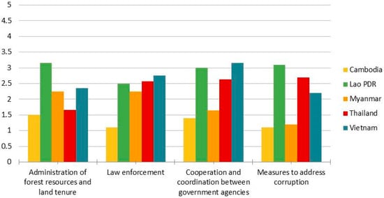 Pillar 3 (Implementation, enforcement and compliance) was viewed as the weakest pillar in two (Cambodia and Myanmar) of the five countries. This indicates that efforts may need to focus more directly at improving governance at the sub-national and local levels. It is notable that both of these countries have ambitious and evolving community forestry programs [,], with one objective being to improve forest governance at the local level []. The findings reveal that whilst there may be effective legislative and policy frameworks in place in most countries, challenges remain at the implementation stage, particularly in locations without support from development organizations []. Furthermore, secure and clear land tenure rights for forest communities continues to be a pressing issue, as reflected in the fact that few countries in the GMS are willing to fully devolve tenure and rights to harvest timber to forest communities []. This points towards the continued prevalence of the belief among decision makers that state authorities have the sovereign right, and are the best equipped to manage the nation’s forest resources.