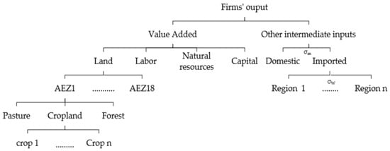In our analysis, we capture land heterogeneity—a key determinant of land use—by using the GTAP-AEZ (Agro-Ecological Zones) extension and its related land use database to the GTAP Standard model. Drawing on the FAO’s Agro-ecological zoning, the GTAP-AEZ land use database distinguishes land use by 18 AEZs [,] defined by the length of growing period and climatic zones (Table A1 in Appendix A defines the global Agro-Ecological-Zones (AEZs) as used in GTAP-AEZ land use extension.). GTAP-AEZ reduces aggregation bias as land use changes between sectors only take place within the same AEZ. Within each AEZ, land supply is constrained by a nested constant elasticity of transformation (CET) structure depicting land rent maximization. The upper nest allocates land among cropland, pasture, and forest based on relative returns to land, while the second nest depicts allocation between different crops (see Figure 1).