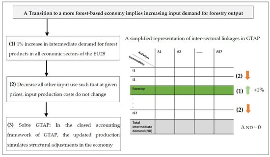 For our simulation experiment, we assume that the EU28 embarks on a bio-based transformation pathway that involves the partial substitution of non-bio-based inputs for products and services (i.e., intermediate inputs) provided from the forestry sector [,], which is described as: Forestry, logging, and related service activities in GTAP9 database. Specifically, we assume a 1% increase in intermediate demand for forest products in all sectors that already use outputs from forestry (see Figure 2). Such a shift in demand patterns could, for example, be the result of changes in production technologies or sourcing preferences including demand for non-traditional biomass uses.