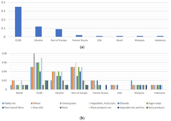 To meet the higher demand for forest products in the EU28, forestry sectors employ more primary factors (land, capital, labor). This leads to higher factor prices and, thus, production costs and selling prices under the competitive market assumption: the price of forestry output will increase by around 0.3% in the EU28 and at a lower magnitude in rest of Europe (0.06%) and other countries such as the USA (0.01%) and Indonesia (0.02%) (see Figure 3a). The highest primary factor price change is observed in the land market where only forestry and agricultural sectors compete, similarly boosting agricultural output prices (see Figure 3b). In the EU 28, cereal grains suffer the highest price increase (+0.08%) followed by raw milk and paddy rice and vegetables, fruits, and nuts production. Outside the EU28, we find that the agricultural and food markets in Rest of Europe, Former Russia and Ukraine are more affected than in the rest of outside-EU28 countries.
