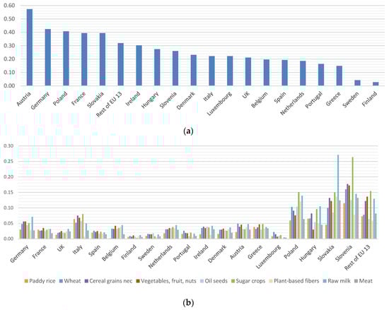 Price changes in the EU28 differ reflecting the importance of the forestry sector in the land use mix. Forest biomass prices respond most expressively in Austria (+0.58%) followed by Germany (+0.42%), Poland (+0.41%), and France as well as Slovakia (+0.39% in both countries) (see Figure 4a). This also affects agricultural and food markets in all EU28 member states, especially in Poland, Slovakia, and Slovenia (see Figure 4b).