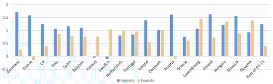 Rest of EU 13 | 0.72 | −0.13 | −0.14 | −0.08 | −0.09 | −0.08 | −0.03 | −0.09 | −0.09 | −0.06 | −0.04 | −0.01 |
