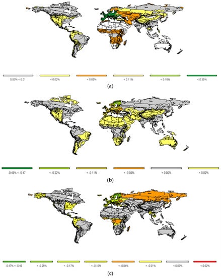 Figure 6a shows that forests expand in all regions. However, the largest impacts are observed in Europe (up to +0.35%) at the expanse of cropland (up to −0.49%) and pasture (up to −0.47%) (Figure 6b,c). This conversion from cropland and pasture to forests reflects increased profitability of the latter due to the rise of forest products prices (see Section 3.1). Outside Europe, the model predicts very low land cover change with scattered impacts in Sub-Saharan Africa, Latin America and Asia, where forests are often converted from pastureland. In fact, cropland increases slightly in all regions (up to +0.02%) while pastureland shows a slight decrease in central Africa and Northern and Western South America. This small indirect effect occurring outside Europe can be mainly explained by the negligible price responsiveness occurring in regions with abundant land resources (see Table 5).