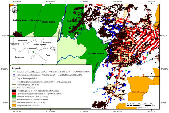 The history of changes in land use and land cover, and timber exploitation in southern Roraima (mosaic area: 66,928 km²; State of Roraima: 224,396.8 km²) was spatially evaluated between 2011 and 2016 by the Deforestation Authorizations (ADs = 103) and Sustainable Forest Management Plans (PMFSs = 4) issued by the environmental agencies: the State Foundation for the Environment and Water Resources of Roraima (FEMARH) and the Brazilian Institute of Environment and Renewable Natural Resources (IBAMA) [27]. Monitoring of forest fires by the National Institute for Space Research (INPE) from January to March in 2016 demonstrated the penetration of fire in Flona Anauá (Figure 1, see Supplementary Materials: Figure S1).