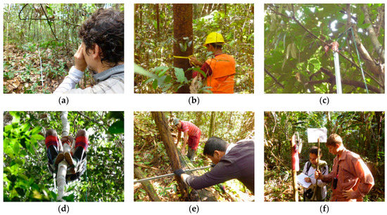 Forest inventory (FI) in Flona Anauá, northern Amazonia of Brazil: (a) Installation of plots (0.25 ha) with a compass and metric tape; (b) Measurement of the diameters of trees at breast height (DBH ≥ 10 cm); (c) Collection of tree branches for botanical identification; (d) The use of “peconha” for branch collection; (e) Measuring the diameters (calipers: Haglӧf) and lengths or heights (metric tape) of dead trees (naturally fallen, illegally exploited, and affected by forest fires); (f) Georeferencing of FI plots and trees positions.