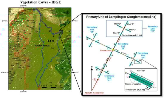 The vegetation cover map from Brazilian Institute of Geography and Statistics - IBGE (https://portaldemapas.ibge.gov.br/; scale of 1:250,000) was used in FI planning (Figure 3). The primary units of the conglomerates were randomly installed within the ecotone areas (LOt), from a mapped polygon vector based on Landsat 8 (OLI) satellite images. This area covers approximately 76,681 ha (767 km²), occupying 29% of the total area of Flona Anauá. Four conglomerates with a standard “cross” format containing 20 plots were installed. Three conglomerates with different formats were installed, but maintaining the plot’s dimensions (tertiary units of 0.25 ha). The use of 0.25 ha plots has been recommended for forest inventories in tropical ecosystems, due to a greater accuracy in representing the forest structure [29,30,31]. An analysis of variance (ANOVA) for the density of the trees (trees·ha−1) and the forest carbon stock (Mg·ha−1) established that there are no requirements (p > 0.05) for a stratified sampling design across the two ecosystems (Forested shade-loving campinarana (Ld) and dense-canopy rainforest, submontane (Ds)).