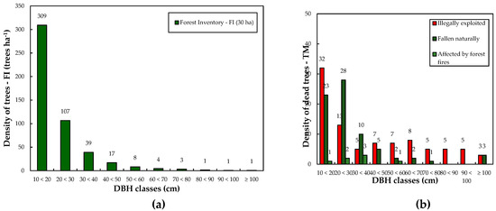 Densities of trees on Flona Anauá, southern Roraima: (a) Mean tree density per diameter class per hectare in the forest inventory (FI); (b) Mean dead tree density per diameter class in the timber measurement (TM) stage: Illegally exploited; Fallen naturally; Affected by forest fires.
