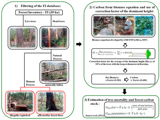 Estimations of the increase in tree mortality and the decrease in forest carbon stock were made in three stages. In the first, the forest inventory (FI) database was used to identify dead trees that died through natural processes (naturally fallen) and dead trees affected by human process (illegally exploited and affected by forest fires), excluding live trees (Figure 5). Subsequently, individual tree carbon values were estimated from a biomass equation developed at Manaus, AM (LMF/INPA), using a correction factor derived from the average of the dominant height of the trees in Roraima. Finally, we estimated the impact of illegal selective logging and forest fires on the increase of tree mortality, and subsequent decreases in forest carbon stock in the Flona Anauá. Mean values and 95% confidence intervals (CI95%) were estimated per hectare and population [36] (see Supplementary Materials: Equations S1; method described by Soares et al. in 2011, p. 163–174)). We assumed in this study that the reduction of the forest carbon stock arising through natural processes would be slow, changing the gas exchange of the forest ecosystem in the medium- and long-term. Dead trees that have naturally fallen will keep their carbon stored for a long time, without considerable losses from the forest. Trees that have naturally fallen are generally not removed from the forest by loggers, because they has low commercial value, due to their decomposition state. In contrast, trees affected by illegal selective logging results in an effective loss of forest carbon stock in the short-term. These trees are immediately extracted, and processed at local sawmills. Forest fires alter the gas exchange of the forest ecosystem in the short term, reducing the forest carbon stock to different degrees, according to fire incidence [15,16,17].