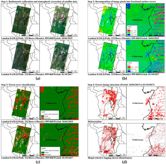 Flowchart of the steps with CLASlite for mapping illegal selective logging in southern Roraima, Brazil: (a) Radiometric calibration and atmospheric correction of the satellite data (including cloud, water, and shadow masking); (b) Decomposition of image pixels into fractional surface covers (photosynthetic vegetation—PV; non-photosynthetic vegetation—NPV and bare substrate—BARE); (c) Forest cover classification; (d) Forest change detection (deforestation and illegal selective logging or forest disturbance).